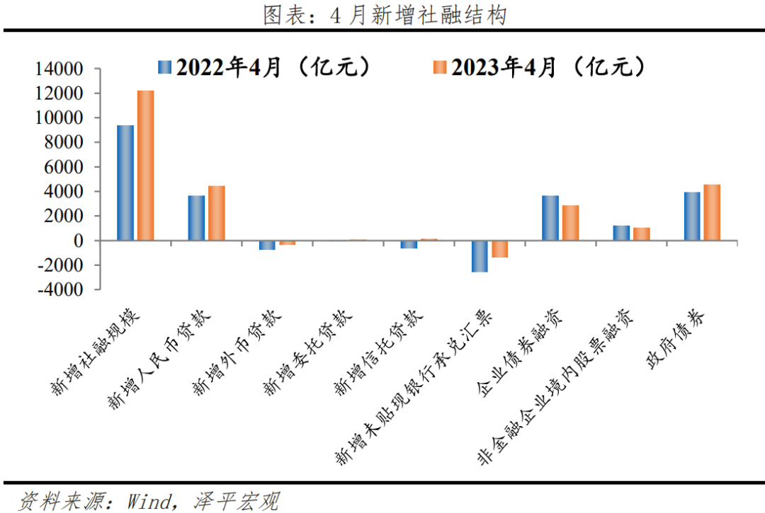 从社融结构来看,表外融资、信贷、政府债券对社融形成主要支撑。1)表内信贷小幅多增。4月社融口径新增人民币贷款4431亿元,同比多增729亿元。2)表外融资减少1145亿元,同比少减2029亿元。其中,未贴现票据减少1347亿元,同比少减1210亿元;信托贷款增加119亿元,同比多增734亿元;委托贷款增加83亿元,同比多增85亿元。3)政府债券小幅多增。政府债券净融资4548亿元,同比小幅多增636亿元。4)4月新增直接融资3836亿元,同比少增982亿元。企业债券净融资2843亿元,同比少增809亿元;4月信用债净融资1,390.58亿元,同比下降41.27%;4月新增股票融资993亿元,同比少增173亿元。