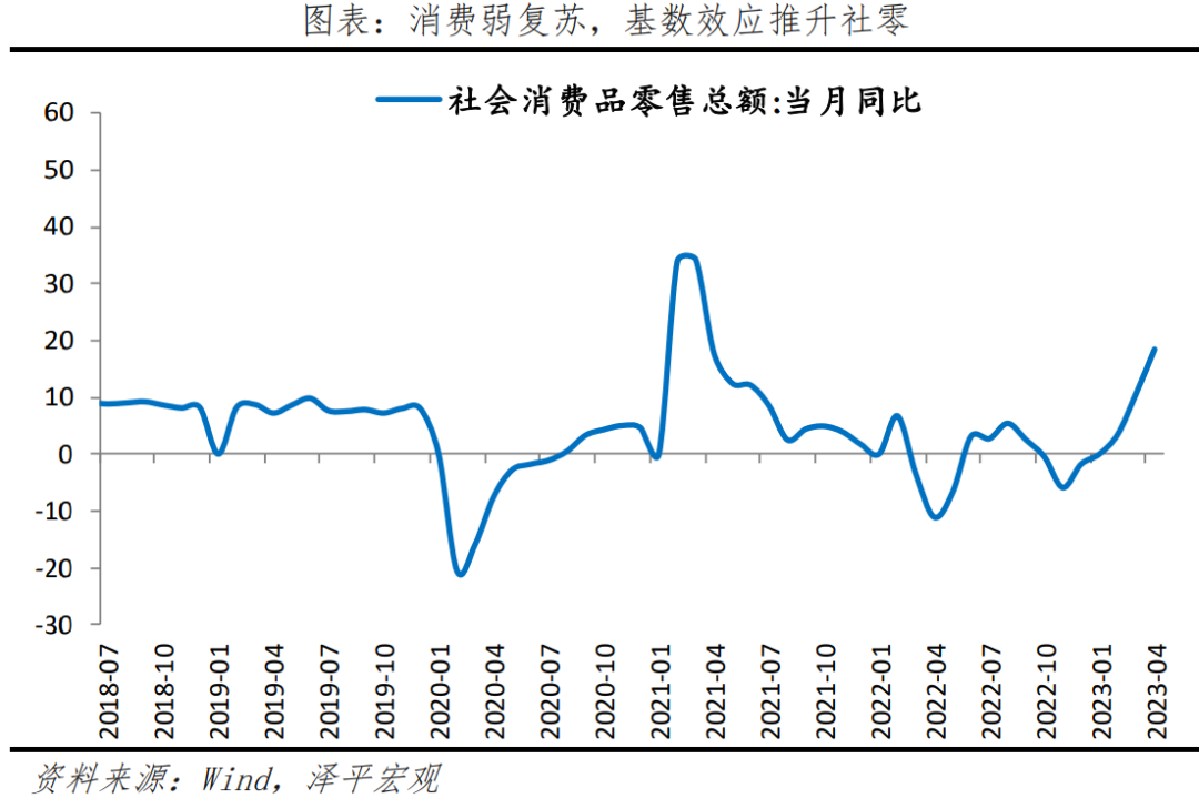 3)消费缓慢复苏,服务消费,但商品消费偏谨慎,预防式储蓄、青年失业率高企、居民收入增长放缓等制约消费增长。4月社会消费品零售总额同比增长18.4%,较3月提升7.8个百分点;两年复合增长2.6%,较3月回落0.7个百分点。4月餐饮收入同比增长43.8%,较3月大幅回升17.5个百分点。分品类看,低基数下,必需消费品、可选消费品、汽车消费、石油及制品类大幅增长;地产后周期产品消费恢复较慢;疫情相关的中西药品、文化办公用品小幅回落。
