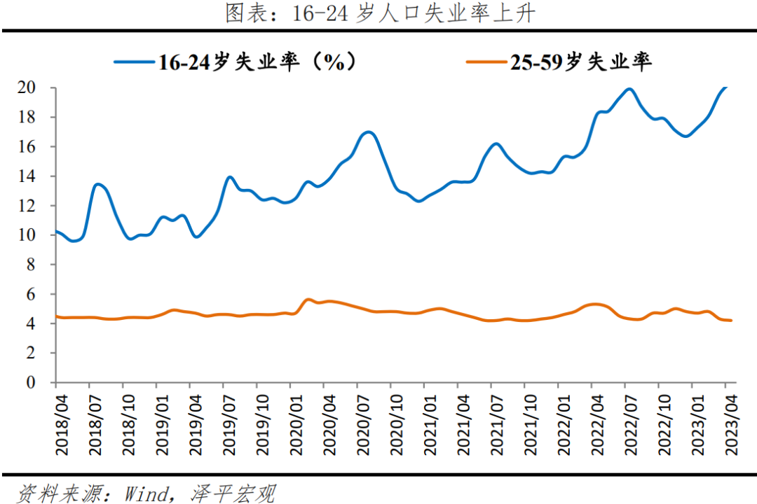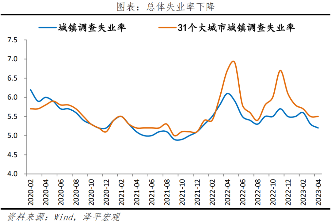 4)总体失业率下降,16-24岁青年失业率上升,需要解决高校毕业生就业问题。4月全国城镇调查失业率为5.2%,较上月减少0.1个百分点。分年龄段看,16-24岁失业率为20.4%,较上月增加0.8个百分点;25-59岁人口调查失业率为4.2%,较上月减少0.1个百分点。2023年全国高校毕业生预计高达1158万人,同比增加82万人。智联招聘《2023大学生就业力调研报告》显示,本科生获取offer比例低于硕博和大专毕业生。