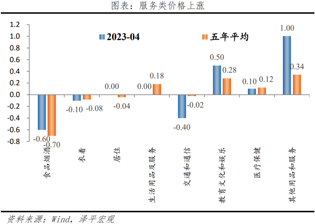 2)非食品环比上涨0.1%,较上月提高0.1个百分点,主因出行和服务活动修复、教育文化和娱乐活动增加、汽车等耐用品降价促销。4月旅游和医疗服务环比分别为4.6%和0.1%,分别较上月增加5.0和0.0个百分点;家用器具和交通工具环比下降0.6%、0.9%,分别较上月变动-1.0和0.7个百分点;燃油小汽车和新能源小汽车价格分别下降1.0%和0.9%。