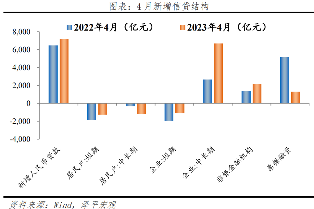 4月信贷投放不及预期,企业中长贷延续多增,居民中长期贷款重回拖累,主因前期信贷冲量透支需求。1)总量上,金融机构口径信贷余额226.16万亿,同比增速11.8%,较上月持平;4月人民币贷款增加7188亿元,信贷投放远低于2017-2021年同期。2)结构上,企业中长贷延续多增,但独木难支;居民贷款中的短贷和中长贷皆由增为减,居民中长期贷款重回拖累。4月新增企业贷款6839亿元,同比多增1055亿元;票据融资增加1280亿元,同比少增3868亿元;企业短贷减少1099亿元,同比少减849亿元;企业中长期贷款增加6669亿元,同比延续多增4017亿元,但多增幅度已经不及1-3月。新增居民贷款减少2411亿元,结束持续5个月的净增态势;居民短贷减少1255亿元,同比少减601亿元;居民中长期贷款减少1156亿元,同比多减842亿元。