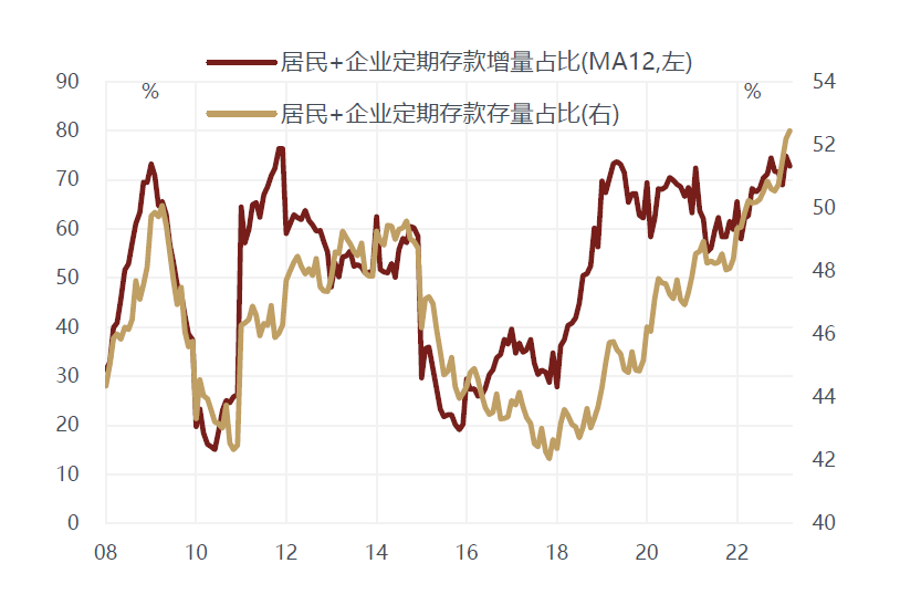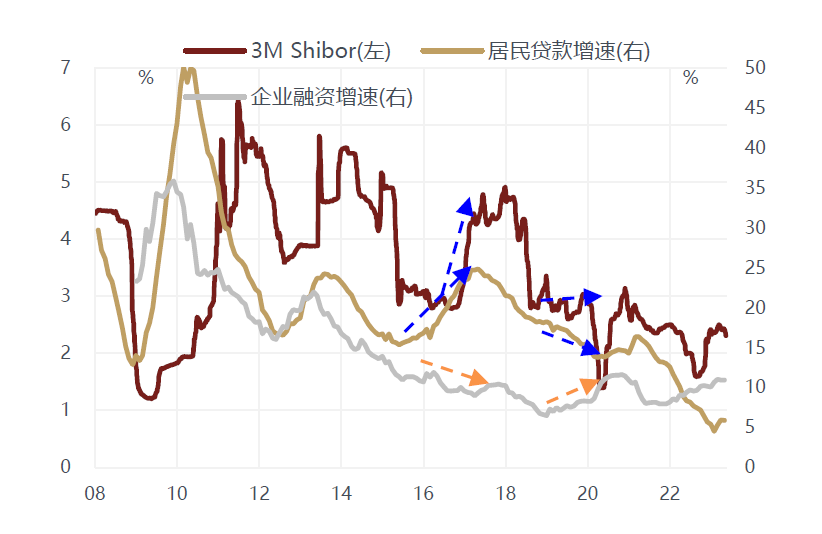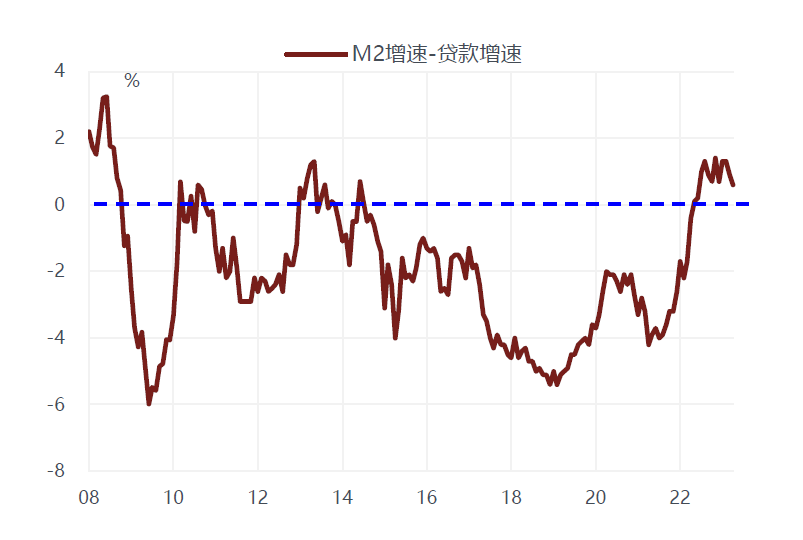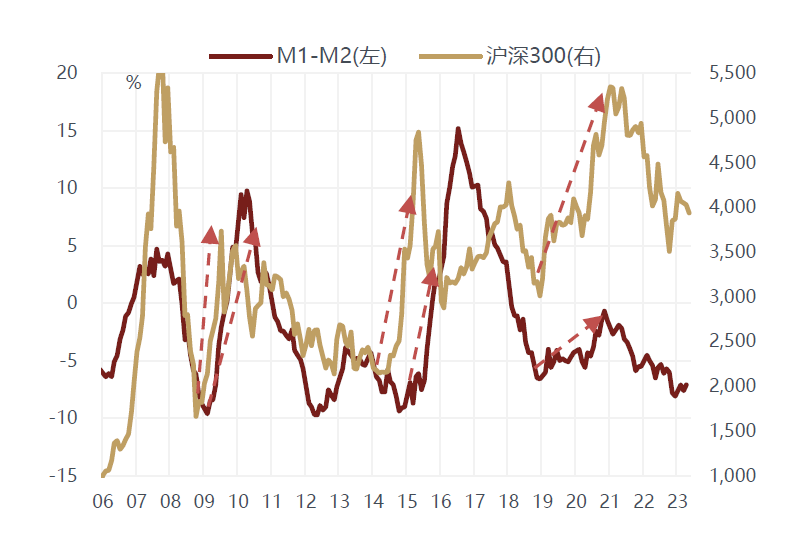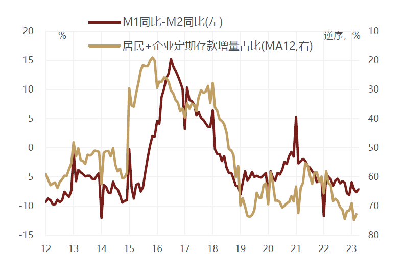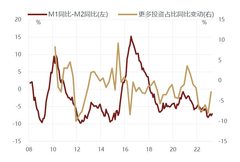 如何判断居民的投资风险偏好开始改善?M1-M2增速差是一个较好的观察指标,与调查问卷中的投资占比的趋势大体一致。当居民的投资或消费意愿上升时,自然会体现为居民储蓄存款向企业活期存款的转化,M1-M2增速差就会回升。2021年以来M1增速持续低于M2增速,而且两者的差距逐步扩大,到今年一季度M1增速虽然出现回升,但仍低于M2增速7-8个百分点。一般情况下,当M1增速比M2增速低的差距缩小至5个百分点以内,市场风险偏好会明显上升,这时居民资金会从理财流向股票基金,理财在赎回的压力下抛售债券,呈现出股涨债跌的跷跷板效应。