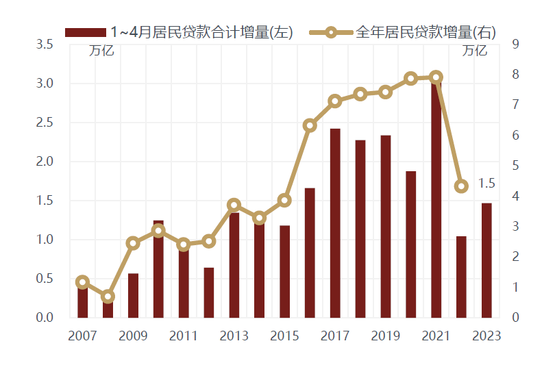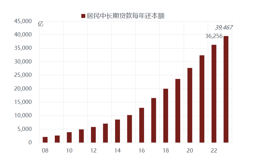 事实上,经济复苏阶段对应的债券收益率走势虽然多数是上行的,但也有例外,取决于融资需求是否显著增强,尤其是居民贷款对利率的拉升最为关键。历史上每一轮利率的趋势性上行,均伴随着居民贷款增速的持续回升。可以对比同样处于经济复苏时期的16年和19年,债券收益率的走势却有明显的差异。16年居民贷款增速回升,而企业融资增速回落,对应利率是回升的;而19年居民贷款增速持续下降,企业融资增速开始回升,对应利率呈现区间震荡的特征。2022年下半年以来,本轮信用扩张主要依靠企业部门,居民贷款增速虽然开始止跌企稳,不过4月末增速仅较去年年底反弹0.5个百分点,回升力度偏弱,导致对利率的推升作用并不明显。由于存量房贷规模逐年增加,每年本金的偿还量也相应水涨船高,预计今年还本额将达到4万亿,相当于每个月居民贷款会自然减少3000亿元。虽然地产销售出现改善,带动居民贷款新增的投放量回升,但越来越多的本金偿付额抵消了相当一部分的贷款投放量,使得居民贷款的单月净增量相对于去年增加得并不多。