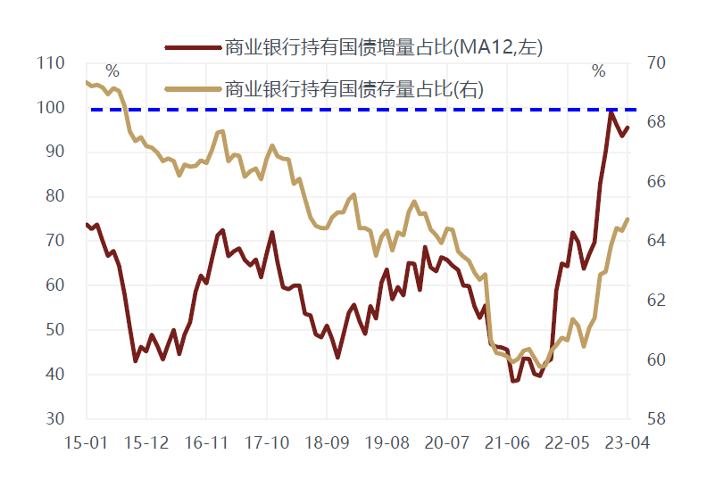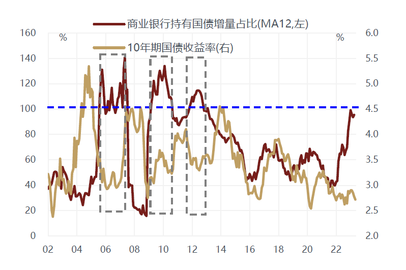 压制利率上行的另一个重要因素来自于异常旺盛的配置需求。国债每年的新增量几乎一半以上都被银行认购,从银行的资产负债表角度理解,M2代表了银行的负债规模,而贷款投放和债券配置都属于银行的资产运用,M2与贷款的增速差可以衡量银行用于配置债券的剩余流动性的宽裕程度。这一增速差从去年5月以来转正,也是15年以来首次回到正区间,今年以来维持高位。从国债的投资者结构数据也能看出商业银行对国债的增持力度在明显加大:22年以来银行持有国债的滚动12个月增量占比持续回升,今年已接近100%的水平,存量占比也上升至65%附近。历史上看,当银行的增量占比达到100%以上的时候,债券收益率往往都呈现易降难升的特征。
