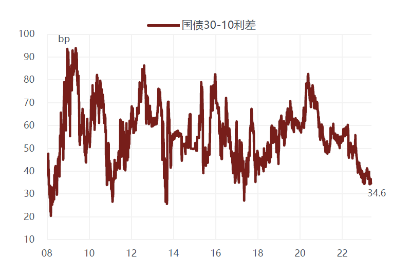 除了银行以外,保险的配置压力也在上升。今年1季度保费收入增速由负转正至9.2%,创疫情后新高,相应地今年一季度保险增持国债近200亿,尤其3月份远超历年同期认购量。由于保险机构更偏好于绝对收益更高的超长期国债,配置力度加大后导致30年国债与10年国债的利差不断缩窄至35bp附近,已经处于历史低位水平。