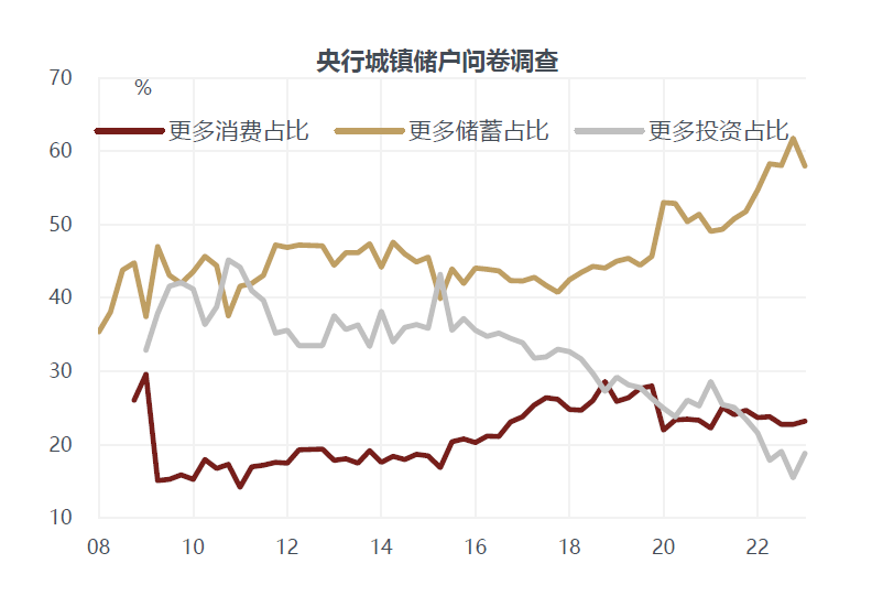 不仅传统的债券投资机构的配置需求上升,券商、理财等交易型机构3月份以来也加大了对债券的投资力度,居民的投资风险偏好疲弱是主要原因。经济复苏对风险偏好的提升无法一蹴而就,尤其在经历了三年的疫情冲击后,居民的资产负债表受到一定的损害,消费强度的改善尚且不易,投资意愿的恢复自然需要更长的时间。居民更倾向于选择保守型的理财产品,而不是高风险的股票基金,从而导致理财被动增加对债券的配置。央行城镇储户问卷调查报告显示,居民在疫情后增加储蓄的同时,投资占比的下滑幅度远大于消费占比,并从21年年底开始低于后者,在去年四季度创下历史新低。今年1季度投资占比虽然已出现回升,但仍处于历史低位。