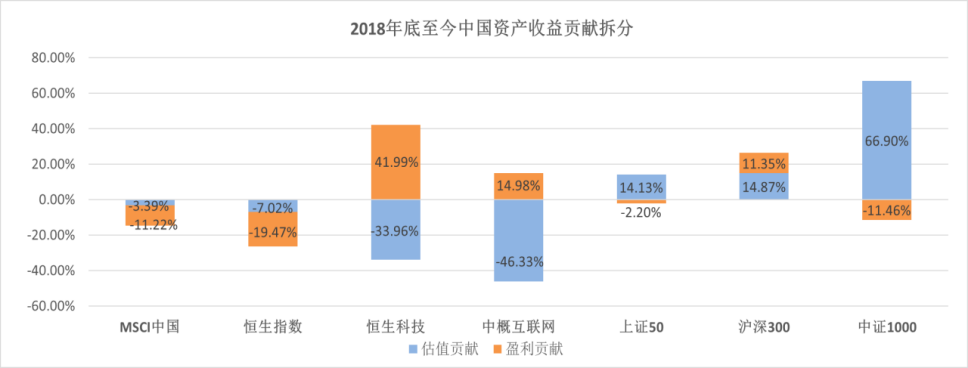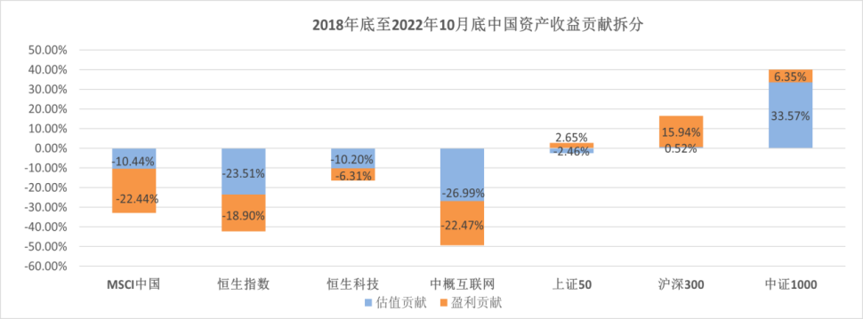 以下两张图展示了当前与2022年10月底的静态估值相较于2018年底部时的估值变化与盈利贡献,我们观察到: