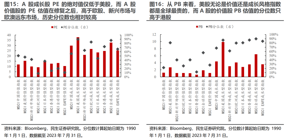 通过比较全球各主要市场成长风格指数与价值风格指数的估值水平与分位数,我们发现:从PE的角度来看,A股成长风格指数的PE绝对值较高,在全球主要股票市场中仅次于美国排名第二;与此同时,A股价值风格指数在7月反弹后性价比略有下降,PE的绝对值已高于欧洲市场、新兴市场、欧澳远东市场的平均水平,估值分位数也相对较高。从PB的角度来看,美股无论是价值还是成长风格指数都是全球最贵的;A股成长指数和价值指数PB估值的绝对值均仅次于美股,不过A股价值股PB估值的历史分位数相对较低,目前仅高于港股。