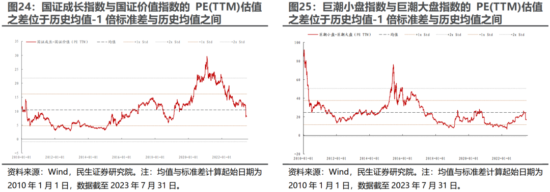 当前不同风格指数之间的估值分化并不极端:当前国证成长指数与国证价值指数的PE(TTM)估值差位于历史均值-1倍标准差与历史均值之间,巨潮小盘指数与巨潮大盘指数的PE(TTM)估值差位于历史均值-1倍标准差与历史均值之间,绩优股指数与中证红利指数的PE(TTM)估值差位于历史-1倍标准差与历史均值之间。