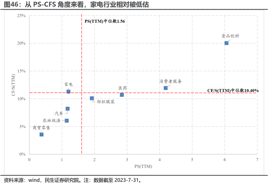 从收益率-ROE角度来看:对于此前跑输ROE最多的大盘价值与大盘成长指数来说,其收益率在7月均大幅追赶ROE;与此同时中证1000指数收益率对ROE的“透支”已基本还清;从行业上看,房地产、非银行金融、银行等收益率落后于ROE较多的行业,7月收益率追赶ROE的幅度最大,而收益率对ROE透支程度较大的电新、电子、军工、计算机等行业7月“还债”的幅度也相对较高。如果我们假设2019-2023年五年收益率向ROE回归以及2023年的累计年化收益率-累计年化ROE回归到过去合理的历史中枢的情形,那么无论在哪种情形下,沪深300、中盘价值的预期收益率均排名靠前。在PB-ROE框架下,煤炭、石油石化行业相对被低估;在PE-G框架下,电新、机械行业相对被低估;在PS-CFS框架下家电行业相对被低估;在股息率-预期ROE变动视角下,银行、石油石化行业相对被低估。