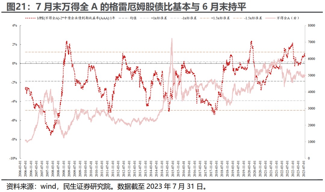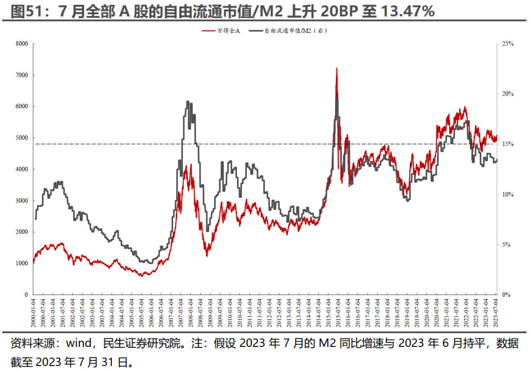 如果假设2023年7月的M2同比增速与2023年6月持平,则截至7月31日全A的自由流通市值/M2将较上一期上升20个BP至13.47%。这意味着A股自由流通市值相对于M2继续扩张。在A股估值相对M2重新扩张的背后,是近期政策支撑下投资者信心逐步修复,“做多中国”的行情已经进入右侧。当前市场的反弹空间并没有面临太大的估值约束,不过在市场底部反弹但主线未收敛、需要修复的行业较多的环境下,投资者想要跑赢指数可能会面临更大的挑战。