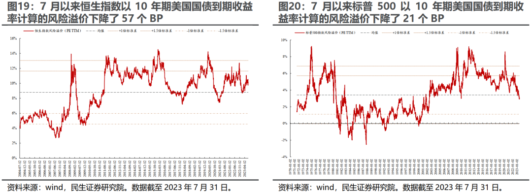 7月以来以10年期中债国债到期收益率计算的万得全A风险溢价下降了12个BP(股票相对债券性价比下降),位于历史均值与历史+1倍标准差之间;不过由于近期余额宝收益率下降较快,以7天余额宝年化收益率计算的万得全A风险溢价上升11个BP,位于历史均值与历史均值+1倍标准差之间;以10年期美国国债到期收益率计算的恒生指数风险溢价下降57个BP,处于历史均值与+1倍标准差之间;标普500指数的风险溢价下降21个BP,处于历史均值-1倍标准差与历史均值之间。