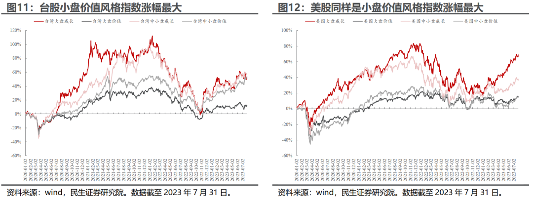 从成长/价值的维度上看,7月全球股市形成价值风格的共振:A股、美股、日股、英股、台股均是价值风格占优,只有港股是成长风格占优。从大盘/小盘风格来看,主要市场之间有所分化:A股市场大盘风格占优;港股、日股、英股、台股均为小盘风格占优;美股成长股中大盘风格占优,价值股中小盘风格占优。