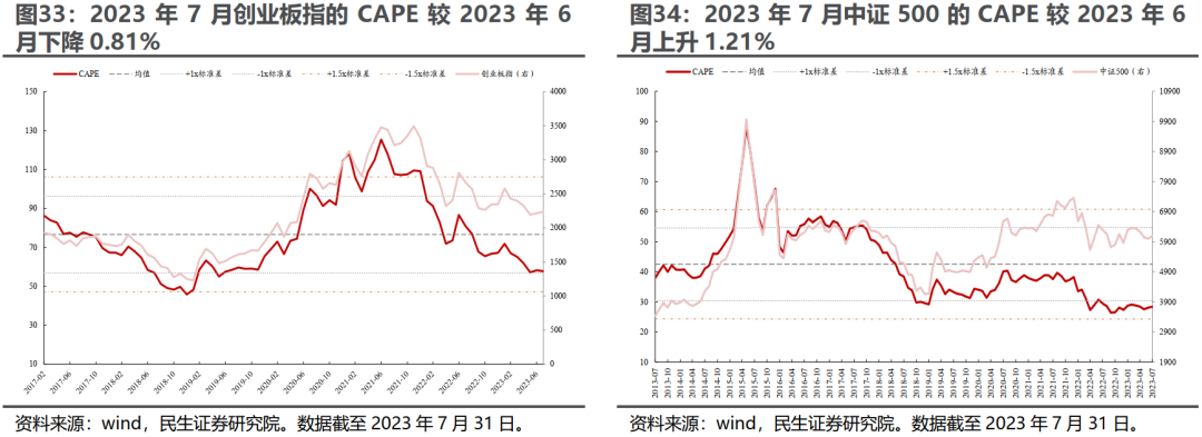从PE/PB/PS估值水平以及分化程度上看,整体市场仍处于相对便宜区间,不过消费者服务、汽车、食品饮料行业可能存在局部高估,不同风格之间的估值分化并不极端。7月A股主要宽基与风格指数的CAPE多有上行,价值风格指数的CAPE上行幅度最大。主要宽基指数中万得全A、上证指数、沪深300指数的CAPE位于历史均值附近,创业板指与中证500的CAPE位于历史-1倍标准差附近;主要风格指数中,除大盘成长的CAPE略高于历史均值外,其余指数的CAPE均在历史-1倍标准差附近。标普500指数与纳斯达克指数的CAPE均上行,分别处于历史+1倍和+1.5倍标准差之间、历史均值与+1倍标准差之间。