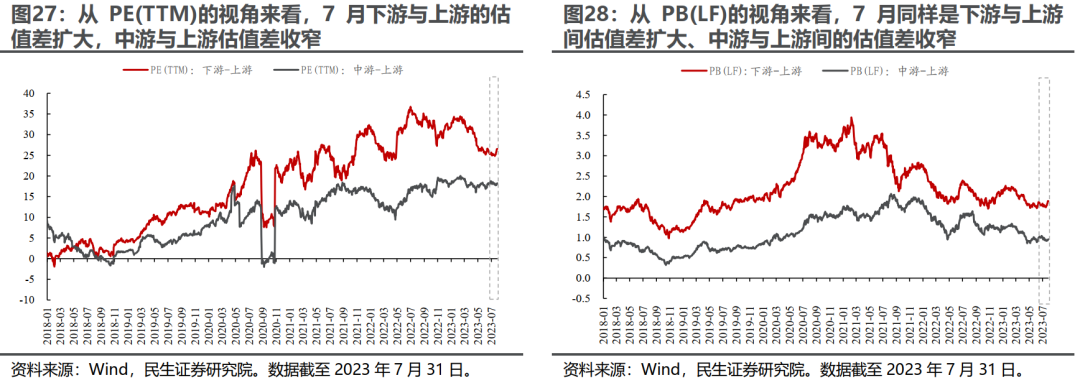 从上下游行业之间的估值分化来看:在PE(TTM)视角下,7月下游与上游之间的估值差扩大,而中游与上游的估值差收窄;在PB(LF)视角下,7月同样是下游与上游估值差扩大、中游与上游之间的估值差收窄。