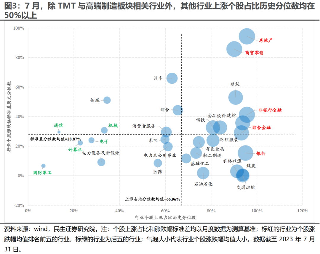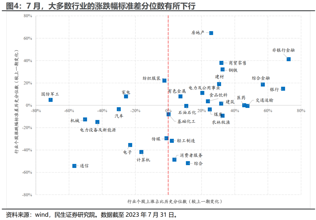 进一步地,我们观测了2023年6月和2023年7月A股各行业内部上涨个股占比历史分位数的变化及个股涨跌幅标准差历史分位数的分布(月度涨跌幅),发现: