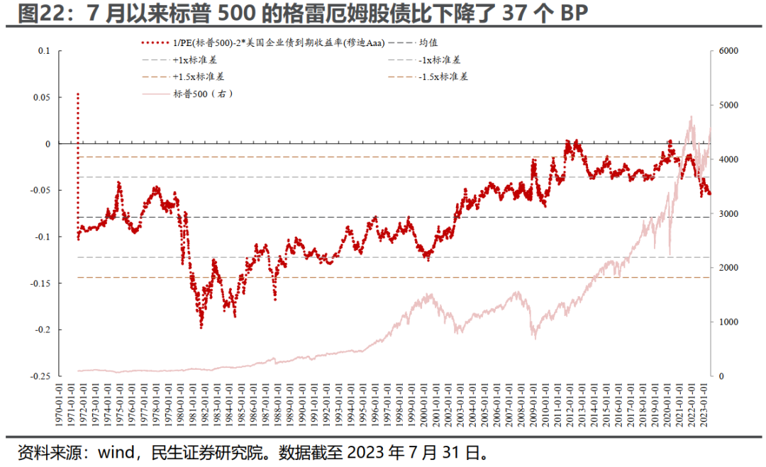 7月,万得全A的格雷厄姆股债比相比6月小幅下降2个BP,当前万得全A的格雷厄姆股债比位于历史均值+1倍标准差与+1.5倍标准差之间;标普500的格雷厄姆股债比下降了37个BP(股票相对于AAA企业债的性价比下降),位于历史均值和+1倍标准差之间。