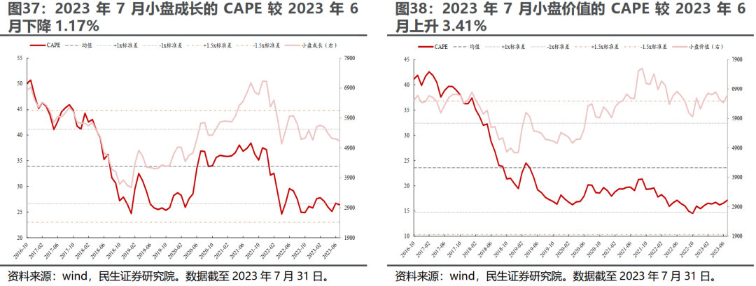 7月美股主要宽基指数的CAPE均上行:标普500指数的CAPE较2023年6月上升2.63%,纳斯达克指数的CAPE较2023年6月上升1.78%。标普500指数的CAPE位于历史均值+1倍标准差和+1.5倍标准差之间,纳斯达克指数的CAPE位于历史均值与+1倍标准差之间。
