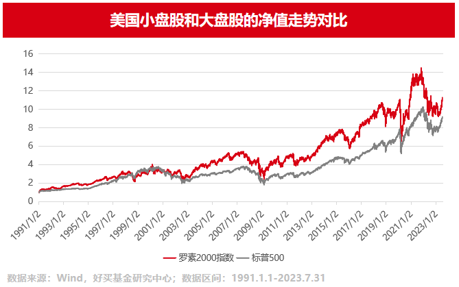 实际上,看美股历史情况,跟踪小盘股的罗素2000指数长期表现的确要优于代表大盘股的标普500,小市值股票存在着不菲的价值。