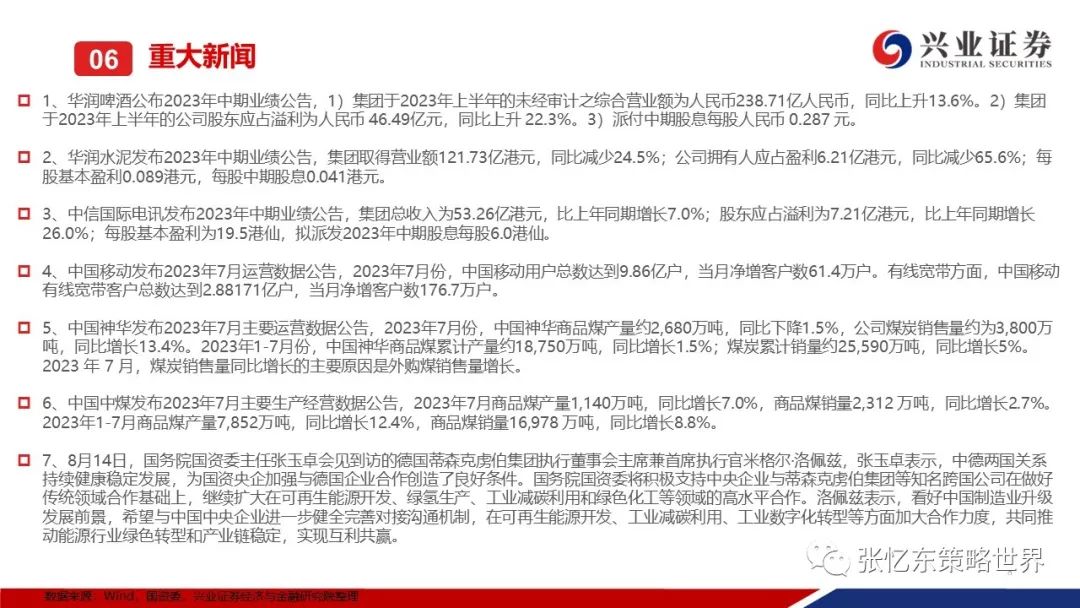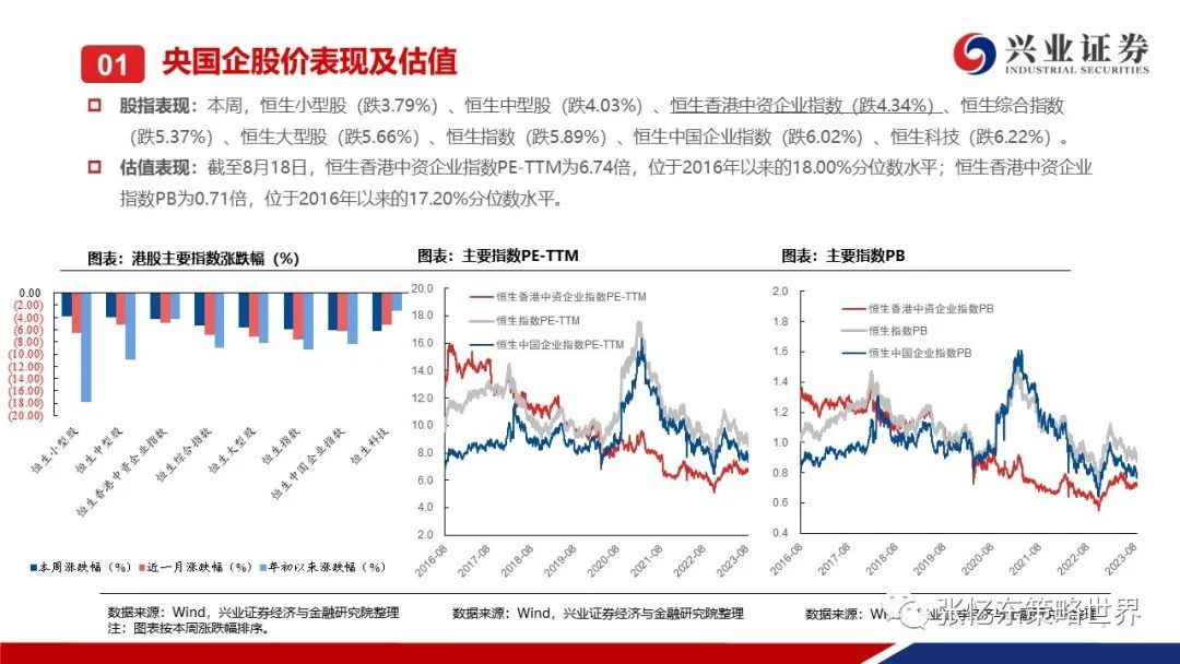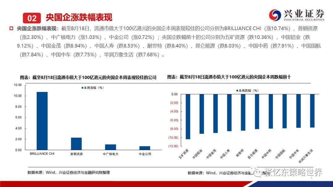 央国企涨跌幅表现:截至8月18日,流通市值大于100亿港元的央国企本周表现较佳的公司分别为BRILLIANCE CHI(涨10.74%)、首钢资源(涨2.30%)、中广核电力(涨1.03%)、中金公司(涨0.72%);央国企跌幅前十的公司分别为五矿资源(跌10.36%)、中国铝业(跌9.12%)、中国金茂(跌8.94%)、中国人寿(跌8.53%)、耐世特(跌8.40%)、昆仑能源(跌8.03%)、中国中药(跌7.91%)、中国国航(跌7.84%)、中国中车(跌7.75%)、华润万象生活(跌7.68%)。