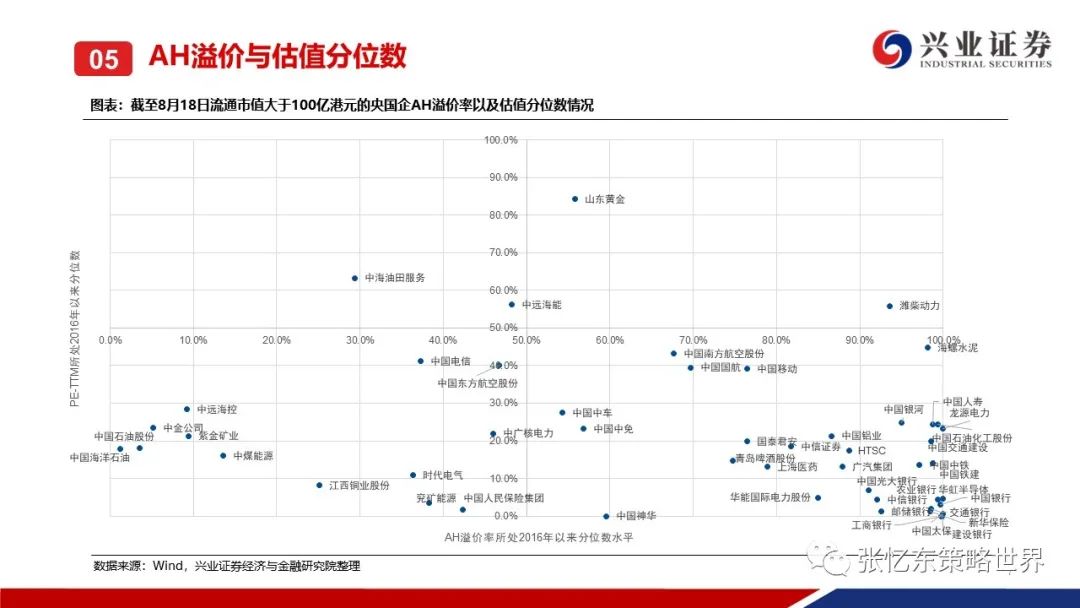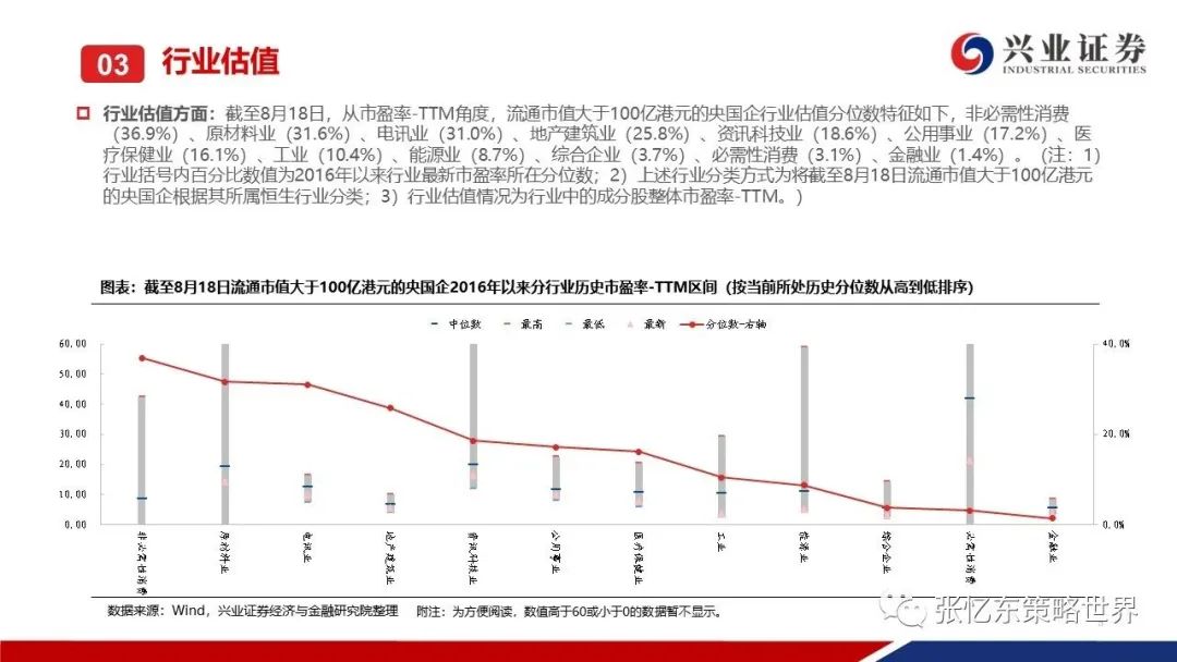 行业估值方面:截至8月18日,从市盈率-TTM角度,流通市值大于100亿港元的央国企行业估值分位数特征如下,非必需性消费(36.9%)、原材料业(31.6%)、电讯业(31.0%)、地产建筑业(25.8%)、资讯科技业(18.6%)、公用事业(17.2%)、医疗保健业(16.1%)、工业(10.4%)、能源业(8.7%)、综合企业(3.7%)、必需性消费(3.1%)、金融业(1.4%)。(注:1)行业括号内百分比数值为2016年以来行业最新市盈率所在分位数;2)上述行业分类方式为将截至8月18日流通市值大于100亿港元的央国企根据其所属恒生行业分类;3)行业估值情况为行业中的成分股整体市盈率-TTM。)