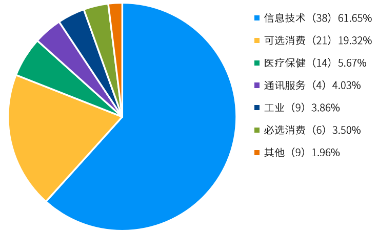 纳斯达克100指数包含100家公司,截至6月底,前10只成份股权重合计达59.20%。从行业分布来看,信息技术行业占比最大(61.65%),其次为可选消费(19.32%)、医疗健康(5.67%)。