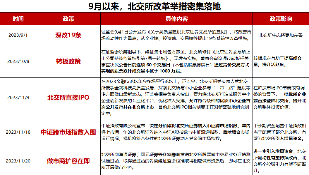 自9月1日证监会发布《关于高质量建设北京证券交易所的意见》(“深改19条”)以来,优化投资者适当性管理、修订转板指引、调整发行底价制度、扩大做市商队伍、融资融券标的股票扩大至全市场、推出公司债(信用债)业务……一系列着眼于丰富产品体系、完善市场基础功能的改革举措密集落地,推进速度和力度均超市场预期。