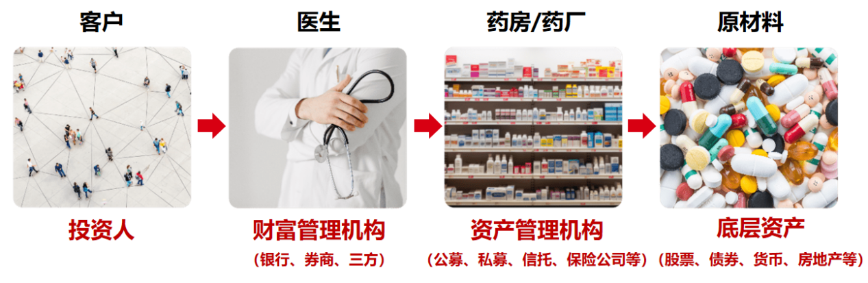 理想的财富管理流程,是客户找到医生(财富管理机构),获取资产配置诊断报告,在专业人员的引导下,再选择优质药厂(资产管理公司)的药(产品),药厂的作用是寻找好的原材料。但现实中往往存在两大“错位”: