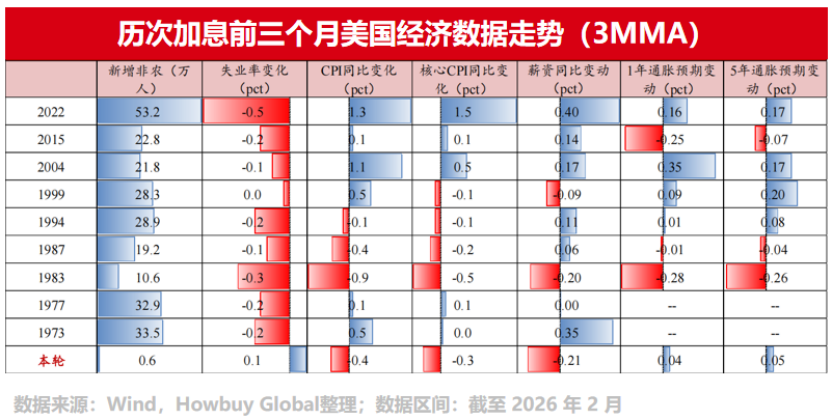 在降息预期降温的同时,有些人也会担忧美联储重启加息。我们先来看一下历次加息前三个月美国经济数据走势。