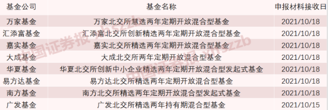 近日证监会官网显示,截至10月20日,目前有广发、南方、华夏、汇添富等8家基金公司申报了北交所基金,其中广发基金成为首家递交申报材料的公募基金管理人,于10月15日申报材料被接收,其余7家均在10月18日同一天被接收。随着公募北交所基金的申报,公众参与北交所股票市场的时间再次拉近。