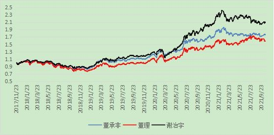 (2)业绩表现上看,董承非 2007 年 2 月在兴全担任基金经理,2013 年 10 月 28 日开始管理兴全趋势。董理2017 年 11 月 23 日开始管理兴全轻资产。谢治宇 2013 年 1 月 29 日开始管理兴全合润。本文将 2017 年 11 月23 日作为起始日,比较三者基金业绩表现(规模加权)。
