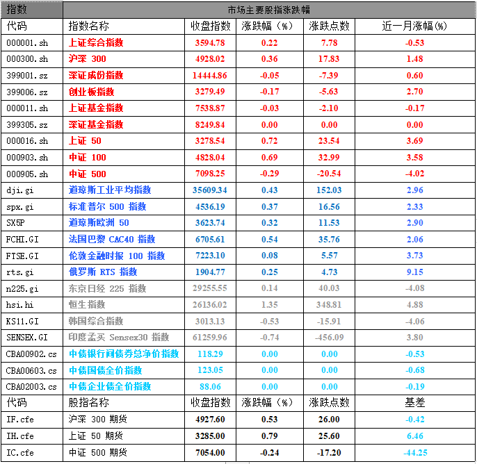 10 月 21 日,沪深两市双双收涨。截止收盘,上证综指收于 3594.78 点,涨 7.78 点,涨幅为 0.22%;深成指收于 14444.86 点,跌 17.83 点,跌幅为 0.05%;沪深 300 收于 4928.02 点,涨 17.83 点,涨幅为 0.36%;创业板收于 3279.49 点,跌 5.63 点,跌幅为 0.17%。两市成交 9929.74 亿元,较前一日交易量减少 2.66%。大盘股强于小盘股。中证 100 上涨 0.69%,中证 500 下跌 0.29%。28 个申万一级行业中有 11 个行业上涨。其中,采掘、银行、房地产涨幅居前,涨跌幅分别为 2.53%、2.15%、1.87%,通信、综合、国防军工表现居后,涨跌幅分别为-1.38%、-1.33%、-1.30%。沪市有 561 只个数上涨,占比 29.23%,深市有 832 只个数上涨,占比 34.07%。48 只个股涨停,4 只个股跌停。沪深 300、上证 50 股指期货主力合约上涨,中证 500 期货下跌。10 月 20 日,欧美主要市场普遍收涨,其中,道指上涨 0.43%,标普 500 上涨 0.37%;道琼斯欧洲 50 上涨0.32%。亚太主要市场普遍上涨,其中,恒生指数上涨 1.35%,日经 225 指数上涨 0.14%。