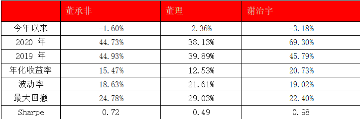 波动率上看,董承非波动略低于谢治宇 0.39%,最大回撤高于谢治宇 2.38%,两人风险控制能力接近。综合来看,样本区间内,谢治宇盈利能力最强,董承非次之,董理最后。