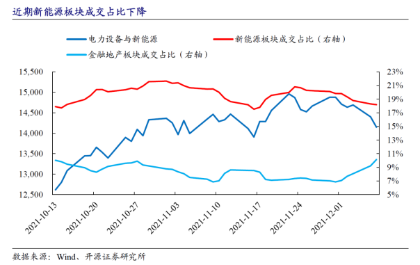统计了最近一段时间新能源相关板块(电气设备与新能源、有色金属)与金融地产版块(银行、非银金融、房地产、建筑材料、建筑装饰等)的成交占比,如图所示,11月下旬以来,新能源板块的成交占市场的比例呈下降趋势,而金融地产版块板块的成交占比则快速上升,在市场成交量变动不大的情况下,这表明交易热点正从新能源板块转移至金融地产板块。