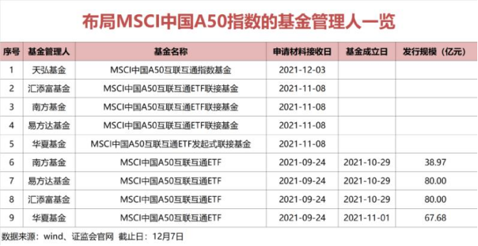 指数的长期赚钱效应和市场影响力,也引发了各家公募巨头的积极布局。数据显示,截至12月8日,目前已经有天弘、华夏、易方达、汇添富、南方基金等5家基金管理人布局了MSCI中国A50互联互通指数产品。其中,华夏、易方达、汇添富、南方等四家巨头,都布局了相关的ETF产品,目前已经成立和上市,相关指数联接基金已经获批。而天弘基金申报了跟踪MSCI中国A50互联互通指数的场外基金,该只基金于12月3日提交申报材料,目前尚未获得受理。