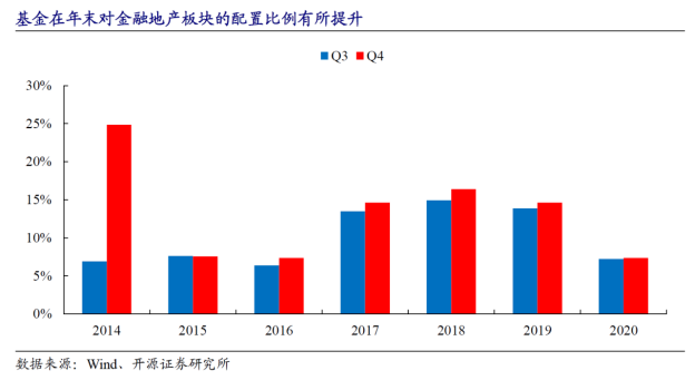 3、年底考核将至,出于稳定业绩的需要,部分基金或将仓位调整至增配金融、地产等低波动板块:我们通过对过去几年偏股型基金的持仓行业分布统计发现,四季报金融地产占股票资产的比例相较三季报有明显上升。