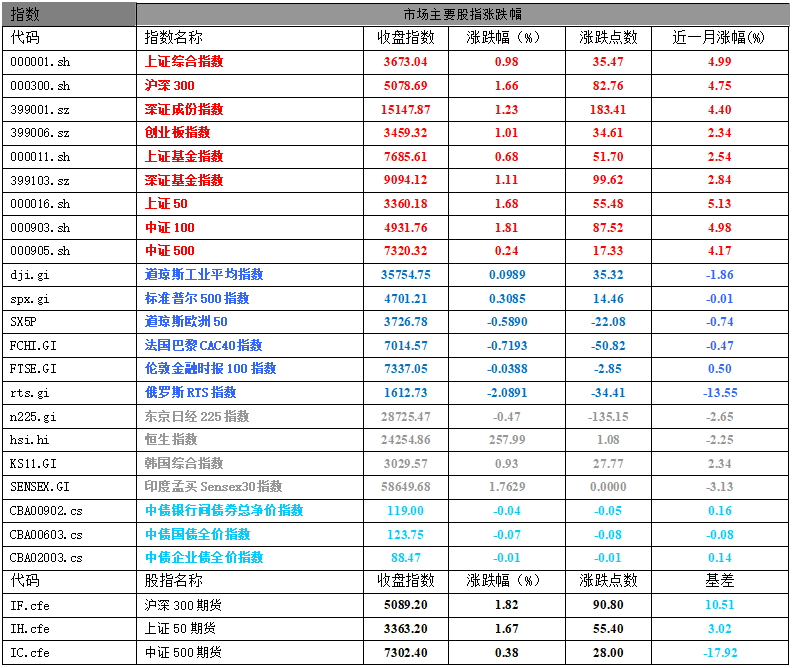 昨日,沪深两市双双收涨。截止收盘,上证综指收于3673.04点,涨35.47点,涨幅为0.98%;深成指收于15147.87点,涨183.41点,涨幅为1.23%;沪深300收于5078.69点,涨82.76点,涨幅为1.66%;创业板收于3459.32点,涨34.61点,涨幅为1.01%。