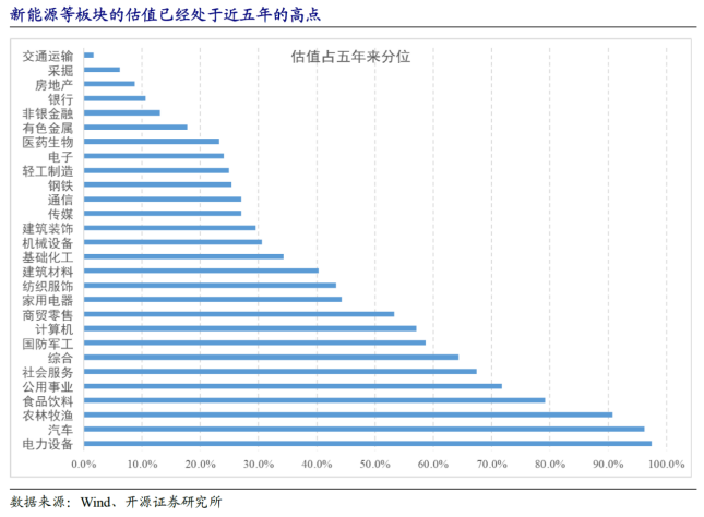 2、存量博弈的环境下,资金风险偏好下降,对高估值板块态度谨慎:从估值角度来看,新能源等板块的估值已经处于近五年的高点,而金融地产等板块估值处在近年低位。在增量资金不明显的情况下,资金风险偏好下降。