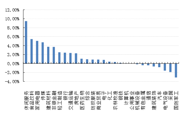 上周,沪深两市双双收涨。截止收盘,上证综指收于3666.35点,涨58.92点,涨幅为1.63%;深成指收于15111.56点,涨219.51点,涨幅为1.47%;沪深300收于5055.12点,涨154.10点,涨幅为3.14%;创业板收于3466.80点,跌11.87点,跌幅为0.34%。两市成交60042.69亿元。总体而言,大盘股强于小盘股。中证100上涨4.04%,中证500上涨0.06%。28个申万一级行业中有20个行业上涨。其中,休闲服务、食品饮料、家用电器表现居前,涨跌幅分别为9.47%、5.47%、5.06%,电气设备、采掘、国防军工表现居后,涨跌幅分别为-1.59%、-1.90%、-3.11%。