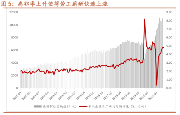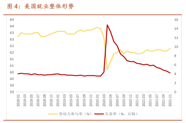 在经济综述部分,美联储虽然继续强调疫情对行业的影响,但也增加了“近几个月来就业稳健增长,失业率实质性降低”的描述,反映出就业对联储政策的影响权重已显著降低。新闻发布会上,鲍威尔表示美国朝着充分就业的方向取得迅速进展,预计将在2022 年实现充分就业。但其同时指出,新冠疫情和奥密克戎新变体的传播会对美国经济及其前景构成风险,抑制劳动参与率的提升。由于联储尚不能确定劳动力短缺还将持续多长时间,因此大幅下调了对失业率的预期。