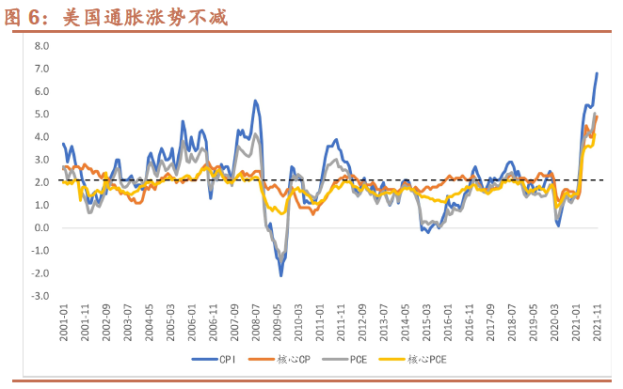 在强劲需求的拉动下,美国通胀不断创出新高。据美国劳动部数据,11 月CPI 同比上涨6.8%,超出6.7%的市场预期,连续第六个月超过5%。从PCE来看,10 月美国个人消费支出(PCE)升至5.1%,核心PCE 升至4.1%,均接近三十年来的峰值水平。