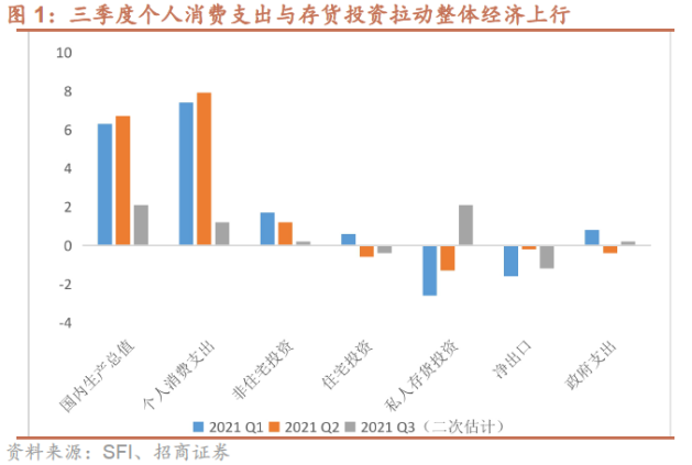 就业复苏形势稳固,离职率居高不下。11 月,U-3 失业率录得4.2%(前值4.6%),初次申请失业金人数骤降;劳动参与率录得61.8%(前值61.6%);新增非农就业21 万,远低于55 万的市场预期;10 月职位空缺数升至1.1 千万,处于历史最高水平。上述情况反映出美国劳动积极性仍然不足,这与疫情下儿童看护、提前退休和劳动者防疫保护等问题有关。结构方面,前期就业复苏缓慢的休闲酒店业、采矿业基本恢复,就业人数已回升至疫情前的92%与93%;不同人种就业形势持续改善,白人、黑人与拉丁美裔失业率分别环比下降0.3、1.2 与0.7 个百分点。