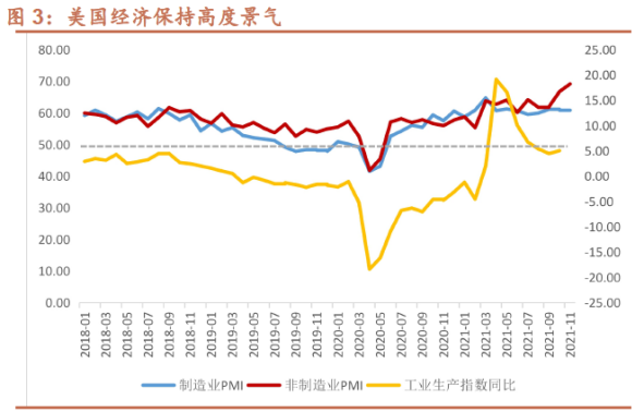 美国经济保持高景气,非制造业景气度升至历史峰值。据美供应商管理协会统计,美国制造业PMI 连续18 个月呈扩张状态。从需求侧来看,11 月新订单PMI 61.5、新出口订单PMI 54.0,虽较三季度略有下降,但仍处于荣枯线以上;客户库存指数继续下降,表明需求仍将持续;从供给侧来看,11 月产出指数61.5,生产要素短缺仍是主要制约因素;就业指数53.3,较三季度提升明显,表明劳工招聘正在改善。综上,美国经济继续保持强势,制造业供不应求的基本格局未变。非制造业景气度持续提升,现已升至本世纪最高水平。11 月非制造业PMI为69.1,较三季度末大幅提升7 个百分点。其中,商业活动指升至74.6 的历史高位,新订单指数上升6 个百分点,新出口订单指数处于荣枯线上方。