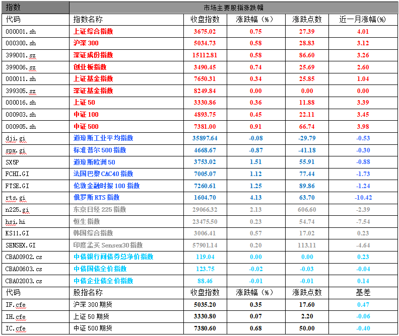 昨日,沪深两市双双收涨。截止收盘,上证综指收于3675.02点,涨27.39点,涨幅为0.75%;深成指收于15112.81点,涨86.60点,涨幅为0.58%;沪深300收于5034.73点,涨28.83点,涨幅为0.58%;创业板收于3490.45点,涨25.69点,涨幅为0.74%。两市成交11135.91亿元,较前一日交易量增加1.10%。小盘股强于大盘股。中证100上涨0.45%,中证500上涨0.91%。28个申万一级行业中有25个行业上涨。其中,钢铁、建筑装饰、传媒表现居前,涨跌幅分别为2.93%、2.01%、1.70%,采掘、农林牧渔、食品饮料表现居后,涨跌幅分别为0.00%、-0.31%、-0.77%。沪市有1196只个数上涨,占比68.97%,深市有1589只个数上涨,占比63.51%。非ST个股中,86只个股涨停,2只个股跌停。股指期货主力合约3个合约均上涨,其中,0只期指好于现货指数。