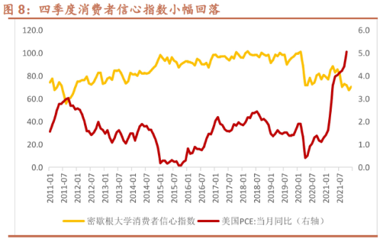 在物价攀升的同时,通胀预期呈上升趋势。12 月,密歇根大学消费者信心指数录得70.4,较三季度末下滑2.4 个百分点。通胀已取代就业,成为影响美国消费者消费支出的首要因素。联储最新褐皮书反映:“尽管合同协议能阻止部分企业提价,但旺盛的需求却对公司提价形成坚实基础”。此外,不断上涨的工资也促进了通胀预期的形成。