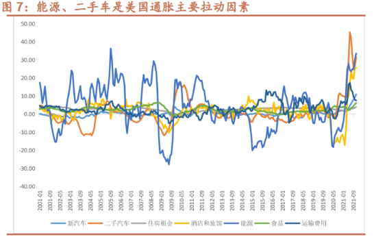 结构方面,11 月拉动美国通胀上行的因素:一是能源燃料等进口价格大幅升高。11 月CPI 分项中的能源价格增速环比提高近4 个百分点,较三季度末提升近10 个百分点。其中,燃料进口价格指数环比提高17 个百分点;二是耐用消费品中的二手车价格重拾涨势。11 月CPI 分项中二手车价格增速环比提升5 个点,反映出芯片供给尚未有效缓解,该形势在Omicron 病毒影响下仍将持续。
