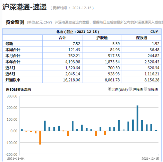 Wind数据显示,截至15日收盘,沪股通、深股通全天分别净流入5.59亿元、1.92亿元,合计7.52亿元。12月1日至今,北向资金已连续超过10个交易日净流入。