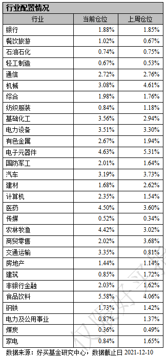 本周,基金配置比例位居前三的行业是食品饮料、电子元器件和医药,配置仓位分别为5.58%、4.63%和4.50%;基金配置比例居后的三个行业是煤炭、传媒和轻工制造,配置仓位分别为0.36%、0.52%和0.67%。