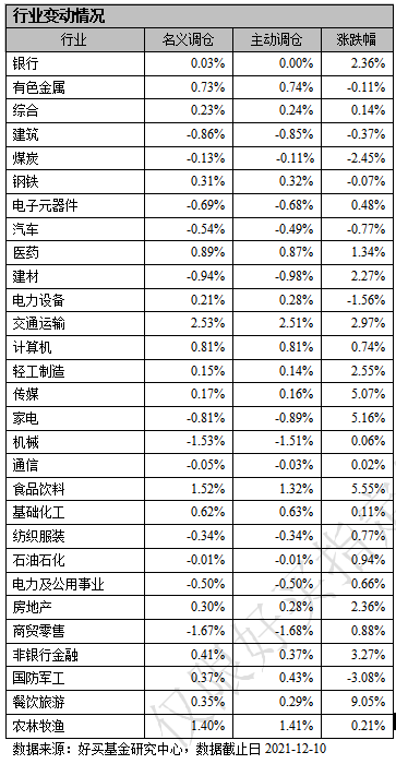 行业配置方面,交通运输、农林牧渔和食品饮料三个板块被公募基金主动相对大幅加仓,而商贸零售、机械和建材逐渐主动减持,与名义调仓基本一致。