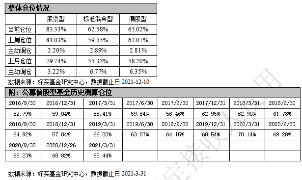 本周,偏股型基金整体小幅加仓2.95%,当前仓位65.02%。其中,股票型基金仓位上升2.30%,标准混合型基金仓位上升3.03%,当前仓位分别为83.33%和62.58%。